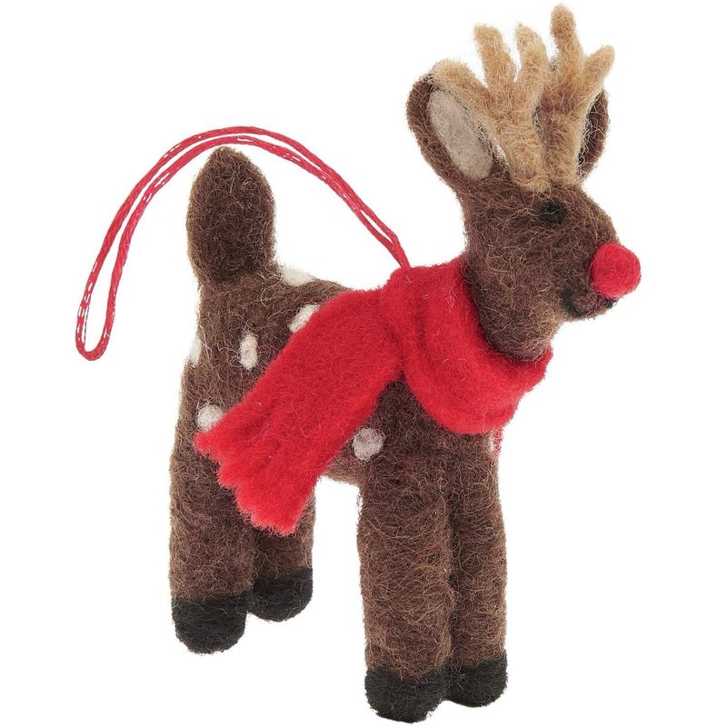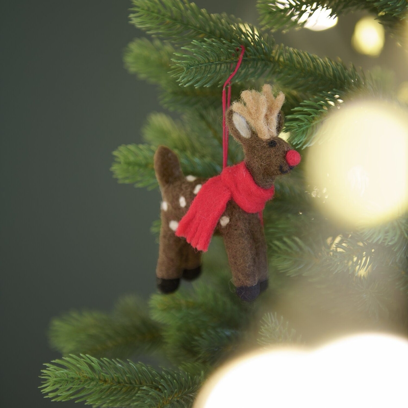 Breng warmte in huis met deze handgevilte hertenhanger van 100% schapenwol. Het bruine hert, compleet met een schattige sjaal, heeft een rustieke en gezellige uitstraling die perfect past bij een natuurlijke kerststijl.