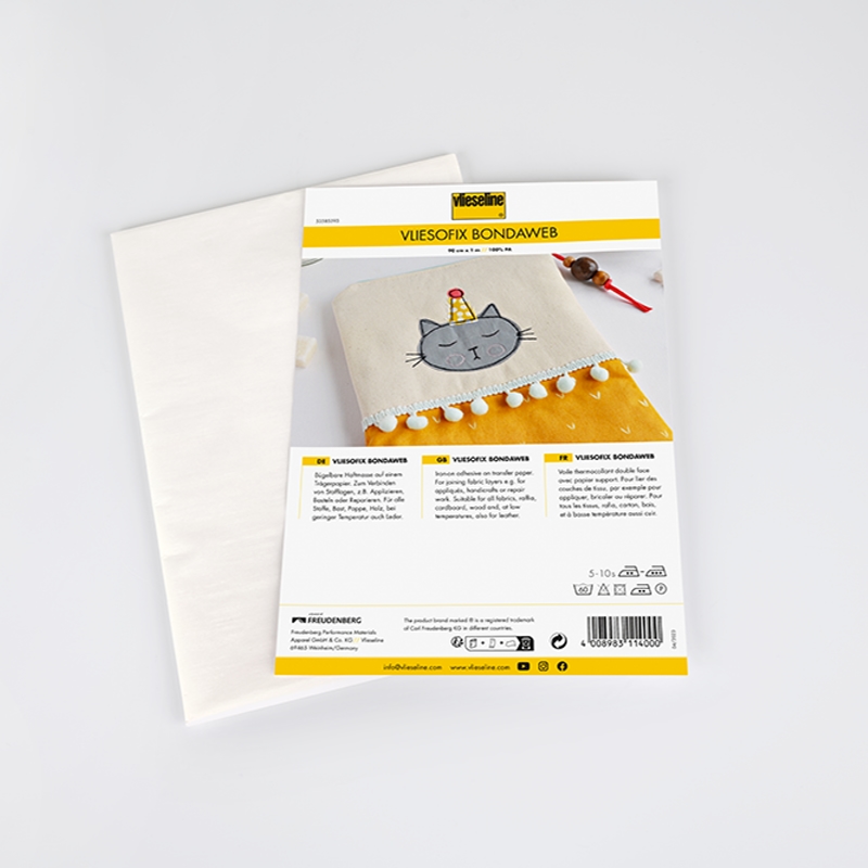 Vlieseline Vliesofix Bondaweb is een strijkvlieseline die geschikt is voor het verbinden van stoflagen. Denk bijvoorbeeld aan het aanbrengen van applicaties, het herstellen van een stof of gebruik het bij het knutselen. Vliesofix Bondaweb is geschikt voor alle stoffen, bij lage temperatuur ook leer en zelfs voor hout.